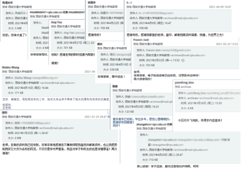 “叮叮,您有新的邮件!”到馆查档再多再急,远程查档仍是我们不能忽略的一环。为贯彻落实“我为师生办实事”实践活动,档案馆促进利用服务方式智能化,深入推进“互联网+综合服务”,实行电子签章及远程档案查阅,聚焦师生办事高频事项,在“师生综合服务大厅”上线“学籍档案查阅”,优化网站主页、微信公众号查档服务流程,利用者可通过网页及公众号等方式获知档案申请流程、步骤及手续。校内师生通过系统申请即可完成档案查阅,校外校友可通过邮箱进行远程申请,切实做到让师生校友“少跑一趟路、少推一扇门”,实现国内外校友及一校四地师生档案利用优质服务。越来越多的师生校友选择远程档案利用,对我们的“交大速度”集体点赞,表示母校的服务“暖暖的”。