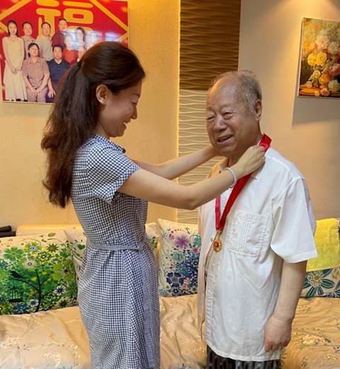 图书馆党总支书记纪洁菲为老党员崔志正同志颁授勋章