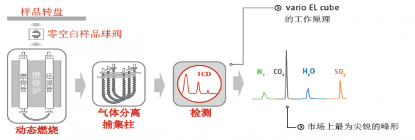 基本原理:CHNS测定模式下,在燃烧管内填充氧化钨作催化剂,样品在高温下,通过特殊的加氧装置,使其在高浓度的氧和氦气流中氧化分解;分解产物通过一根加热的内有线状铜的还原管,使NO、NOx、SO3还原成N2和SO2,其中N2直接通过热导检测器TCD被检测,而混合气体中的CO2、SO2、H2O通过3根U形柱被吸附分离,接着分别加热3根U形柱,解析出CO2、SO2、H2O,并逐次通过TCD而被检测。