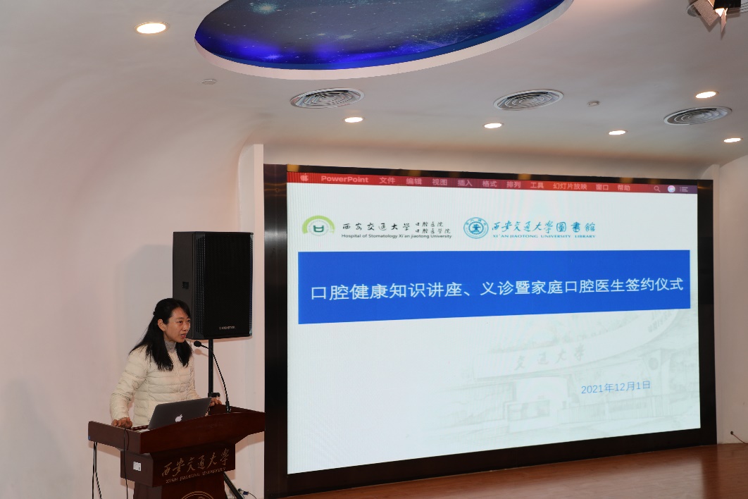 为深入学习贯彻党的十九届六中全会精神,持续深化党史学习教育成效,增强“我为师生办实事”的实效性,努力将好事实事办在教职员工的心坎上。12月1日,机关与直属单位党委、图书馆工会小组携手口腔医院党委、口腔医院第一门诊部在图书馆星空报告厅开展口腔健康知识讲座、义诊及家庭口腔医生签约活动。口腔医院第一门诊部主任司红羚、口腔医院预防保健中心主任田建刚、口腔医院第一门诊部副主任代泉及医师团队、图书馆副馆长纪洁菲、图书馆教职员工代表40余人参与活动。机关与直属单位工会副主席高文莉主持活动。
