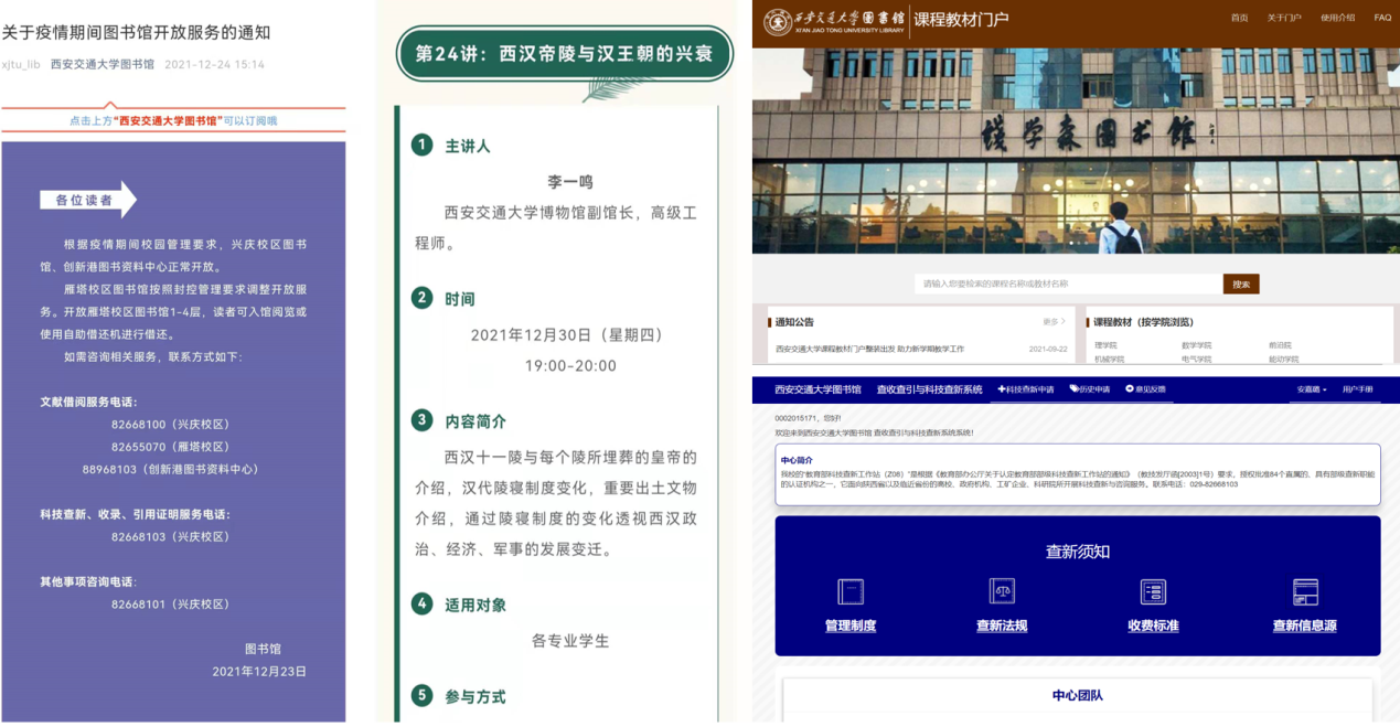根据学校疫情防控管理要求,兴庆、雁塔、创新港三校区图书馆于12月28日起闭馆。“需读者之所需,急读者之所急”,图书馆立即启动服务紧急预案,开启5个服务通道、8个服务热线,确保读者服务及线上咨询“零障碍”。 围绕同学们普遍关注的各类问题,图书馆积极应对。