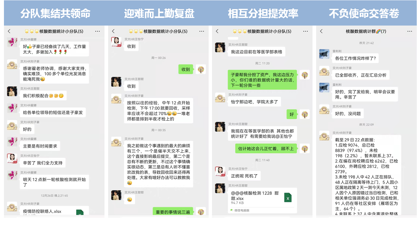 西安本轮疫情爆发之后,呈现出隐匿性传播,社区性传播等特点,防控难度升级,大规模、多轮次核酸检测成为了发现潜在病例,阻断疫情传播最有效的手段。为配合疫情防控,人力资源部承担起了全校核酸检测数据的统计工作,由部长雷利利亲自统领,综合办主任翟娜全程督导,另有4名人力资源部同志组成的“核酸数据统计小分队”应战而生。