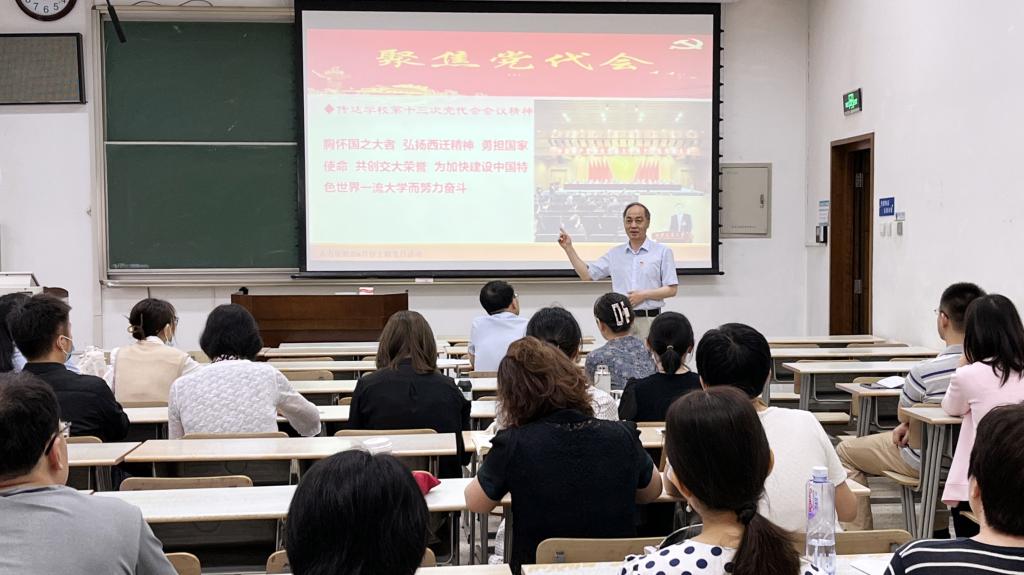 副部长饶昱久介绍了学校第十三次党代会情况,带领全体成员认真学习大会报告、传达会议精神。