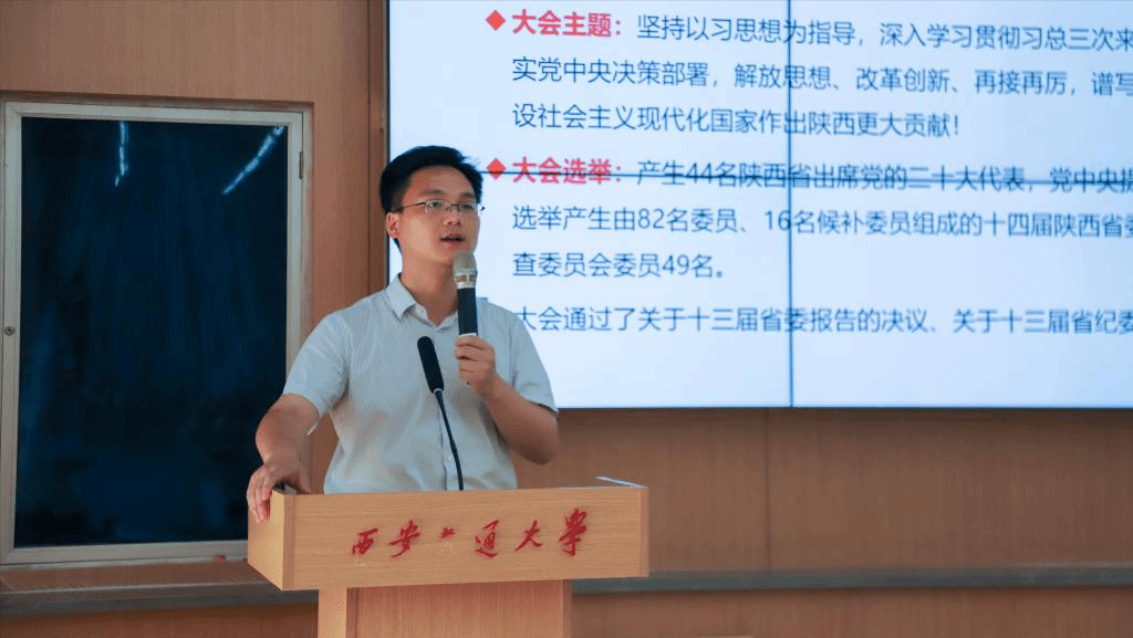 团委副书记毕晓楠从党的建设、西迁精神、立德树人、科技创新、学科建设、深化改革、师生员工等角度对党代会报告进行解读。