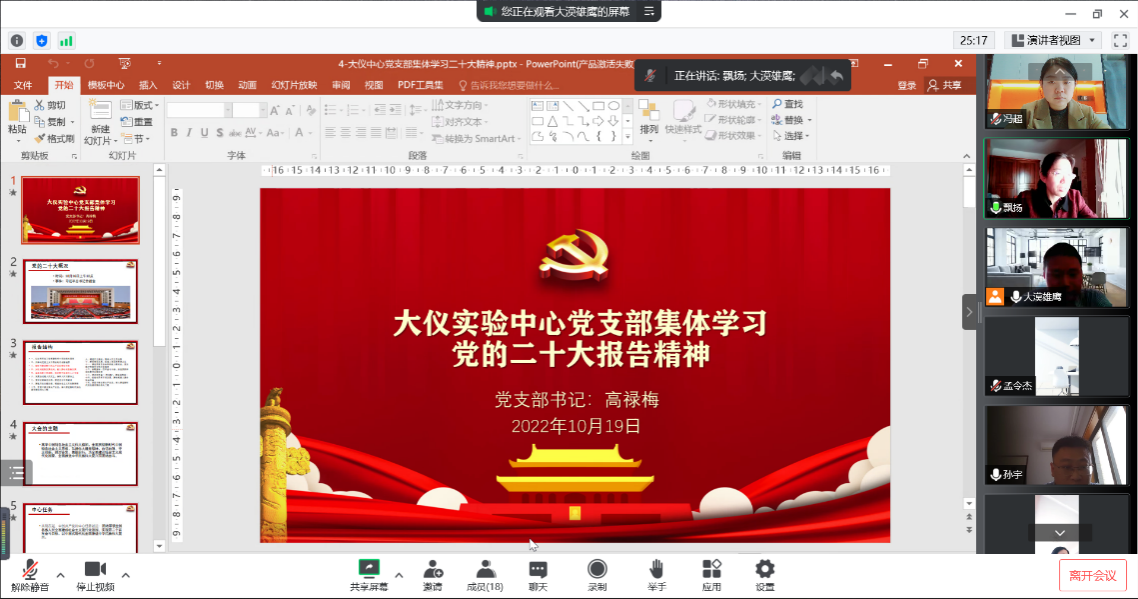 10月19日下午,大仪实验中心党支部通过网络视频会议的形式召开党员扩大会议,围绕党的二十大报告开展专题学习研讨,支部委员和党员同志参加会议。会议由支部书记高禄梅同志主持。