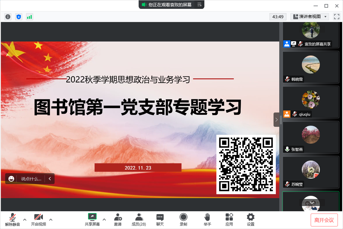 11月23日下午,图书馆第一党支部专题学习通过线上和线下相结合的方式展开。本次学习的内容是“三秦楷模”先进事迹、《中国共产党普通高等学校基层组织工作条例》以及《中国共产党党员教育管理工作条例》。