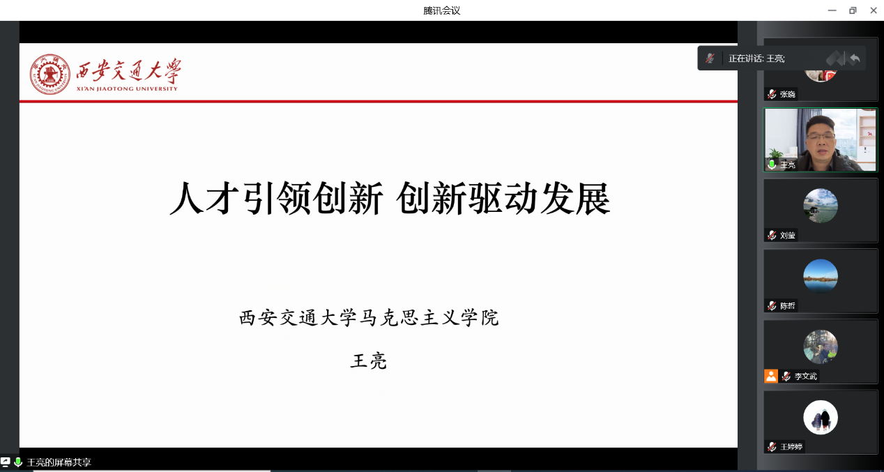 陈哲首先介绍此次共建活动的背景,今年是钱学森诞辰111周年,12月11日是西安交通大学第十四个“钱学森日”。钱学森学长一生献身于国家民族,献身于科学事业,鞠躬尽瘁,奋斗不已,为中国航天事业和尖端科技奠基。学长一直对西安交通大学寄予厚望,2001年12月11日在对交大师生的题词中说到,“希望西安交通大学全体师生要继承和发扬母校优良传统,热爱祖国,崇尚科学,追求真理,报效人民,在二十一世纪,努力把西安交通大学建成世界一流大学。”为学习和弘扬钱学森精神,借此契机我们邀请到马克思主义学院副教授王亮以解读党的二十大报告中的科技创新为主题,作《人才引领创新创新驱动发展》的专题报告。