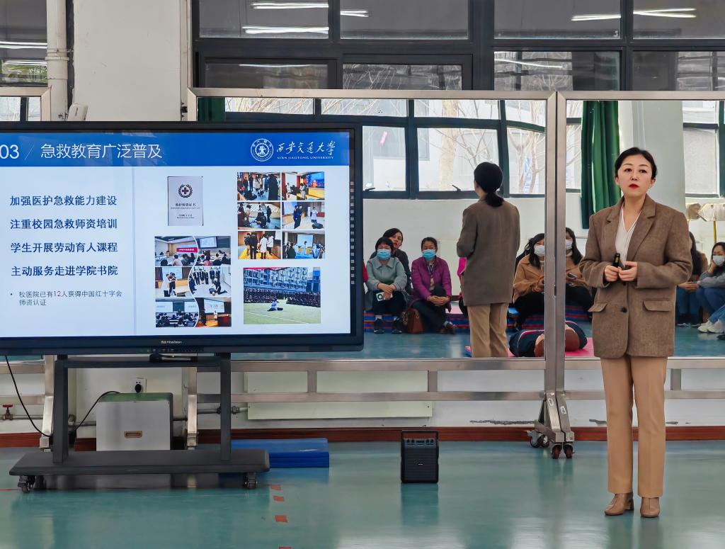 佘君介绍了心肺复苏术(CPR)的概念和重要性、成功的指标,演示了基础生命支持(BLS)的基本流程,即确认环境安全、判断意识、呼救、判断呼吸和大动脉搏动、胸外按压、清理异物、开放气道,人工呼吸、AED电除颤等,讲解了自动体外除颤器(AED)的使用具体流程和注意事项。