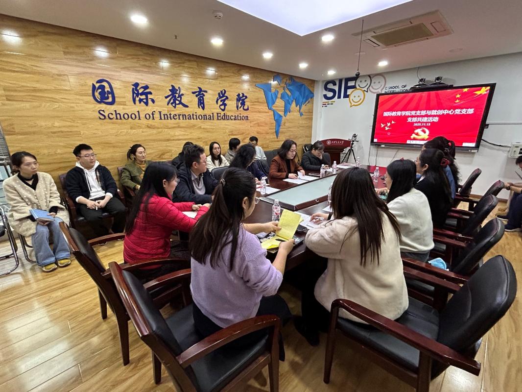 为深入贯彻落实新时代党的建设总要求,创新党建工作模式,以高质量党建推动业务高质量发展,11月13日下午,学生就业创业指导服务中心(以下简称“就创中心”)党支部与国际教育学院党支部举行结对共建交流活动。会议由国际教育学院党支部纪婷副书记主持。